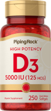 11395<p><strong>The “Sunshine Vitamin”</strong></p><p>Produced by natural exposure to sunlight, Vitamin D is one of the most important vitamins in the human body, commonly known as the “Sunshine Vitamin.” During times without sun exposure, a supplement is the best way to support your body with this essential nutrient.</p><p>Add some sunshine to daily routine with PipingRock® High Potency Vitamin D3. This maximum strength formula delivers 250 mcg (10,000 IU) of Vitamin D3 in each quick release softgel, 1,250% of your daily value! We take the time to test our vitamins for purity and potency, ensuring they meet our exceptionally high standards of quality. Our formula is gluten-free and non-GMO with no preservatives, so nothing will stand in the way of you feeling your best every day.</p>