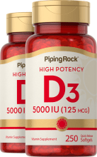 11395<p><strong>The “Sunshine Vitamin”</strong></p><p>Produced by natural exposure to sunlight, Vitamin D is one of the most important vitamins in the human body, commonly known as the “Sunshine Vitamin.” During times without sun exposure, a supplement is the best way to support your body with this essential nutrient.</p><p>Add some sunshine to daily routine with PipingRock® High Potency Vitamin D3. This maximum strength formula delivers 250 mcg (10,000 IU) of Vitamin D3 in each quick release softgel, 1,250% of your daily value! We take the time to test our vitamins for purity and potency, ensuring they meet our exceptionally high standards of quality. Our formula is gluten-free and non-GMO with no preservatives, so nothing will stand in the way of you feeling your best every day.</p>High Potency Vitamin D3, 10,000 IU, 250 Quick Release Softgels